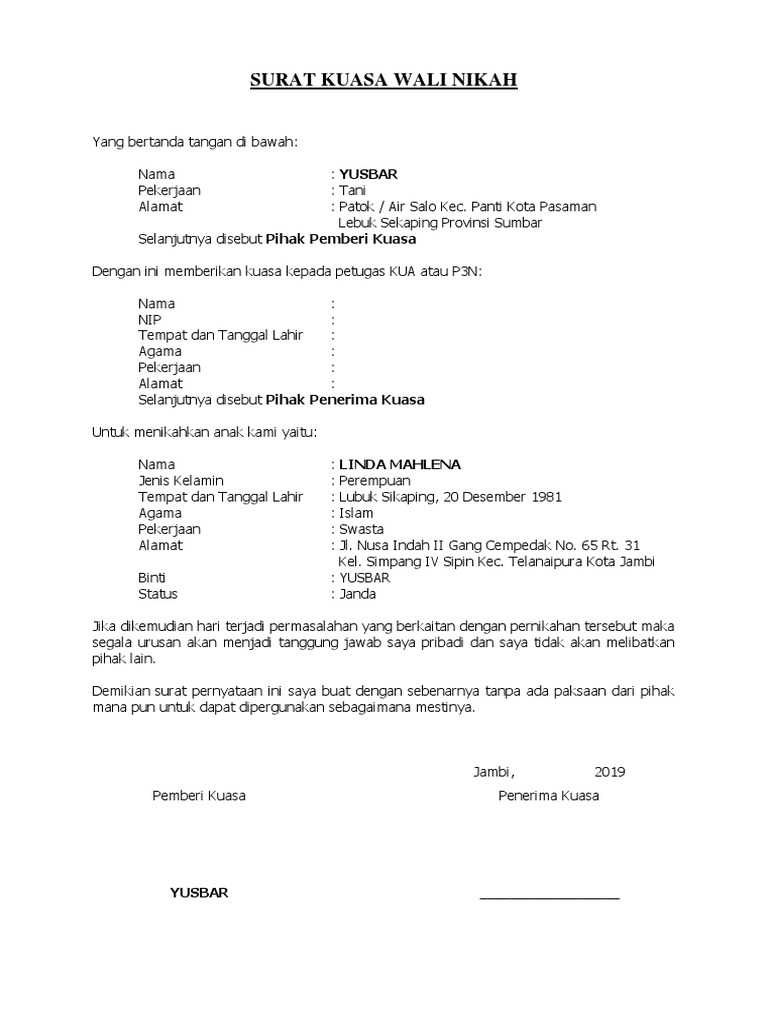 Contoh Surat Kuasa Untuk Menjadi Wali Nikah