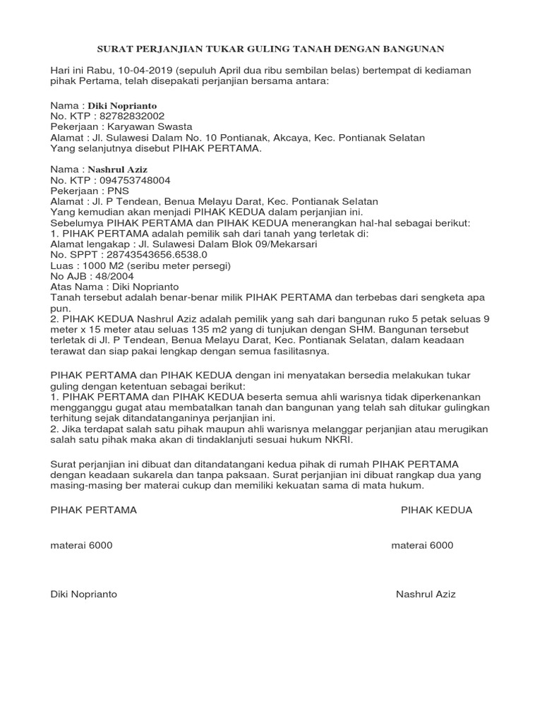 Contoh Surat Perjanjian Tukar Guling Tanah Gawe Cv. Setiap perjanjian tukar menukar tanah tidak boleh ada yang merugikan salah satu pihak ya.